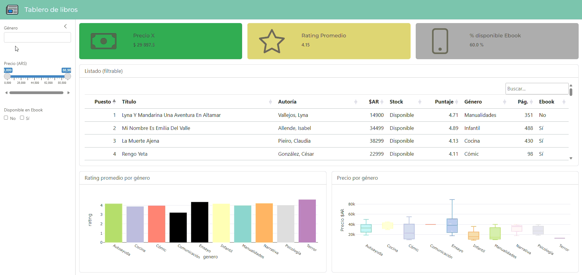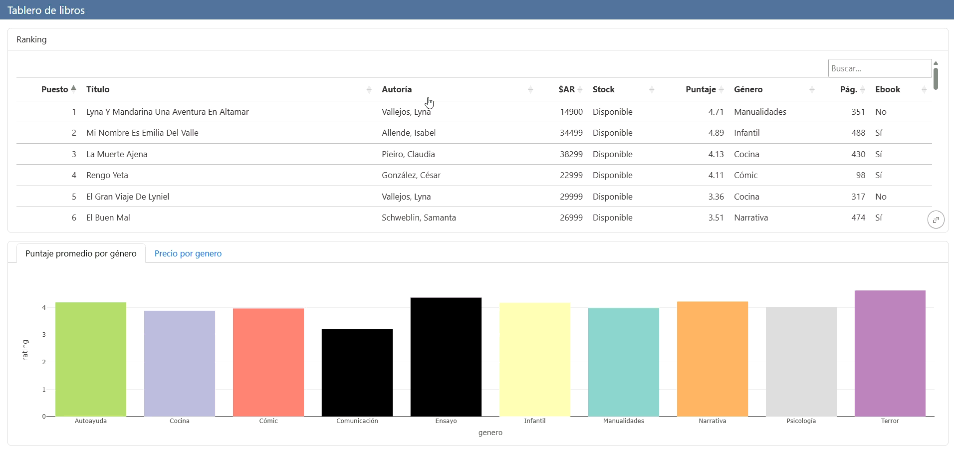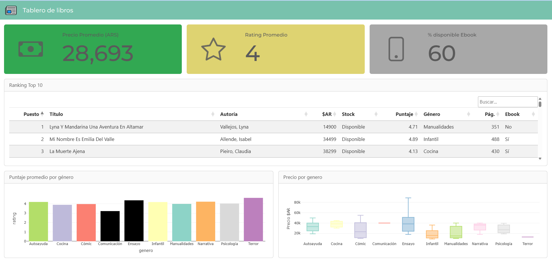 ```{r}# Tabla en DT con librosdatatable( libros, options = list( pageLength = 10, order = list(list(0, 'asc')), # ordenamos la tabla por ranking dom = 'ftp', # solo filtro arriba (f), tabla (t) y paginación (p) language = list( searchPlaceholder = "Buscar...", search = "" # saca el texto de 'Search:' ) ), class = 'table table-striped table-hover table-sm', # usamos Bootstrap filter = "none", # sin filtros en columnas rownames = FALSE, colnames = c("Puesto","Título","Autoría","$AR","Stock","Puntaje","Género","Pág.","Ebook"))``````{r}# Grafico 1 barplot raiting promedio por géneroplot_ly( data = libros, x = ~genero, y = ~rating, type = "bar", transforms = list(list( type = "aggregate", groups = ~genero, aggregations = list( list(target = "y", func = "avg", enabled = TRUE) ) )), marker = list(color = colores), showlegend = FALSE)``````{r}# Gráfico 2 boxplot de precios por géneroplot_ly( data = libros, x = ~genero, y = ~precio, color = ~genero, colors = colores, type = "box", boxpoints = "outliers", showlegend = FALSE) %>% layout( xaxis = list(title = ""), yaxis = list(title = "Precio $AR") )```