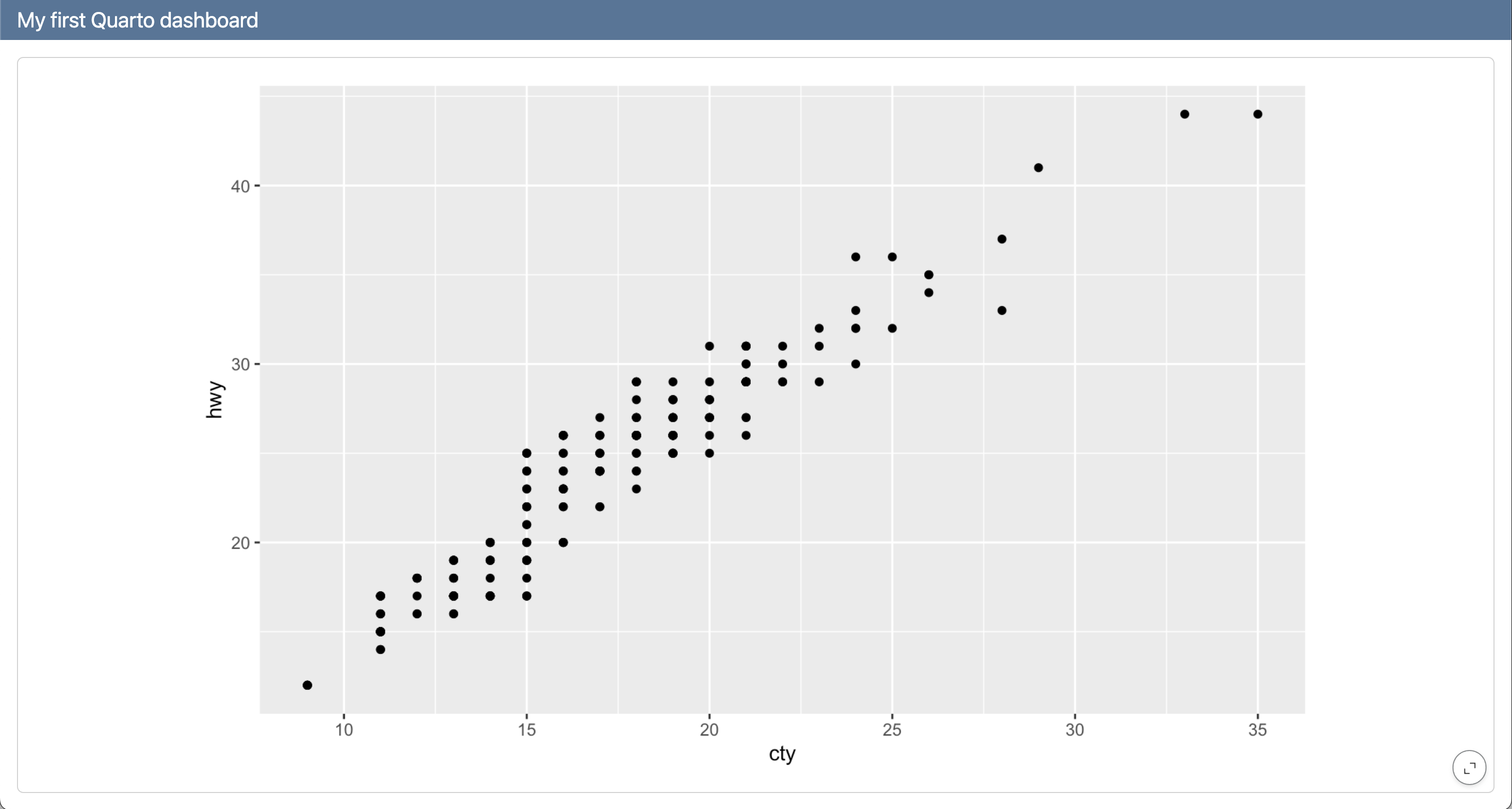 ---title:"Mi primer tablero en quarto"format: dashboard---```{r}library(ggplot2)``````{r}ggplot(mpg, aes(x = cty, y = hwy)) + geom_point()```